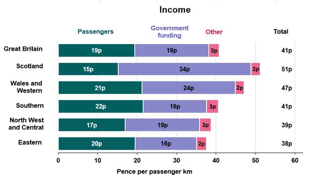 The rise in fare income contributed to a reduction in government support, with funding from the UK and devolved governments falling by £0.9 billion to £11.9 billion. ORR noted that passengers in Scotland continued to benefit from the highest level of government support per passenger kilometre.