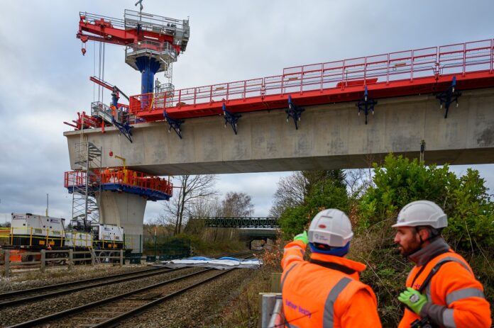 “Our teams worked around the clock to safely erect two viaduct spans over an operational railway,” he said. “The specialist cantilever technique we’re using, which involves a 22-metre mast and a swivel crane to position each segment, has not been used in the UK before HS2 and allows us to deliver these structures with precision while keeping disruption to a minimum.”